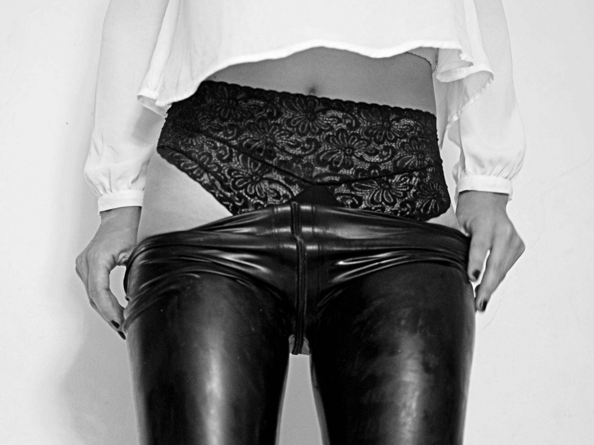 Black leggings with two way crotch zipper, black latex top with back zipper, gloves and hood.