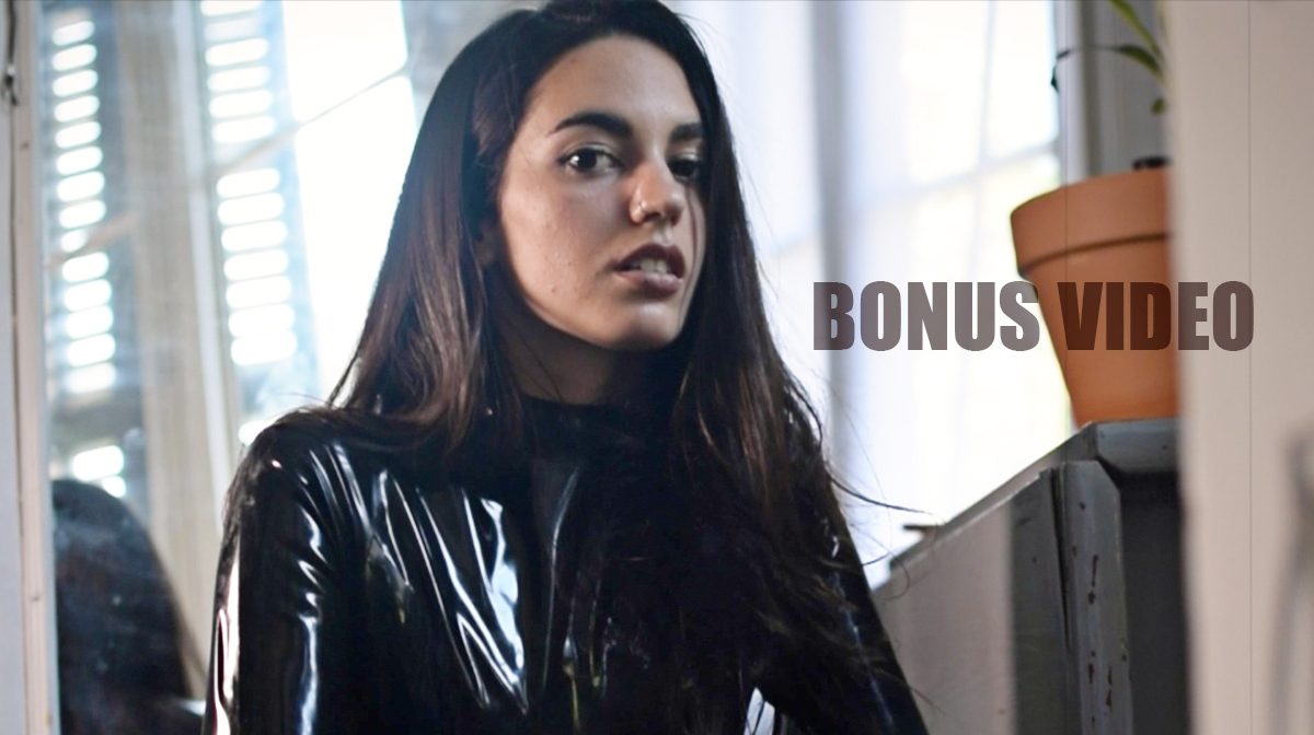 Candy in her room, feeling a newfound sense of freedom, sensuality and empowerment wearing this extra high-waisted extra thin 0.25 m.m latex briefs, pink net fish stockings and a black bra with lace.